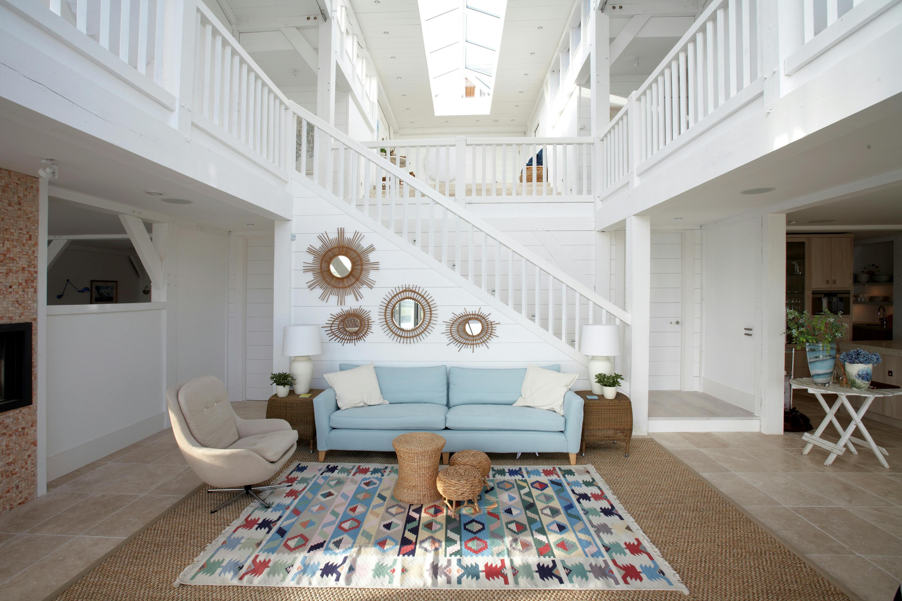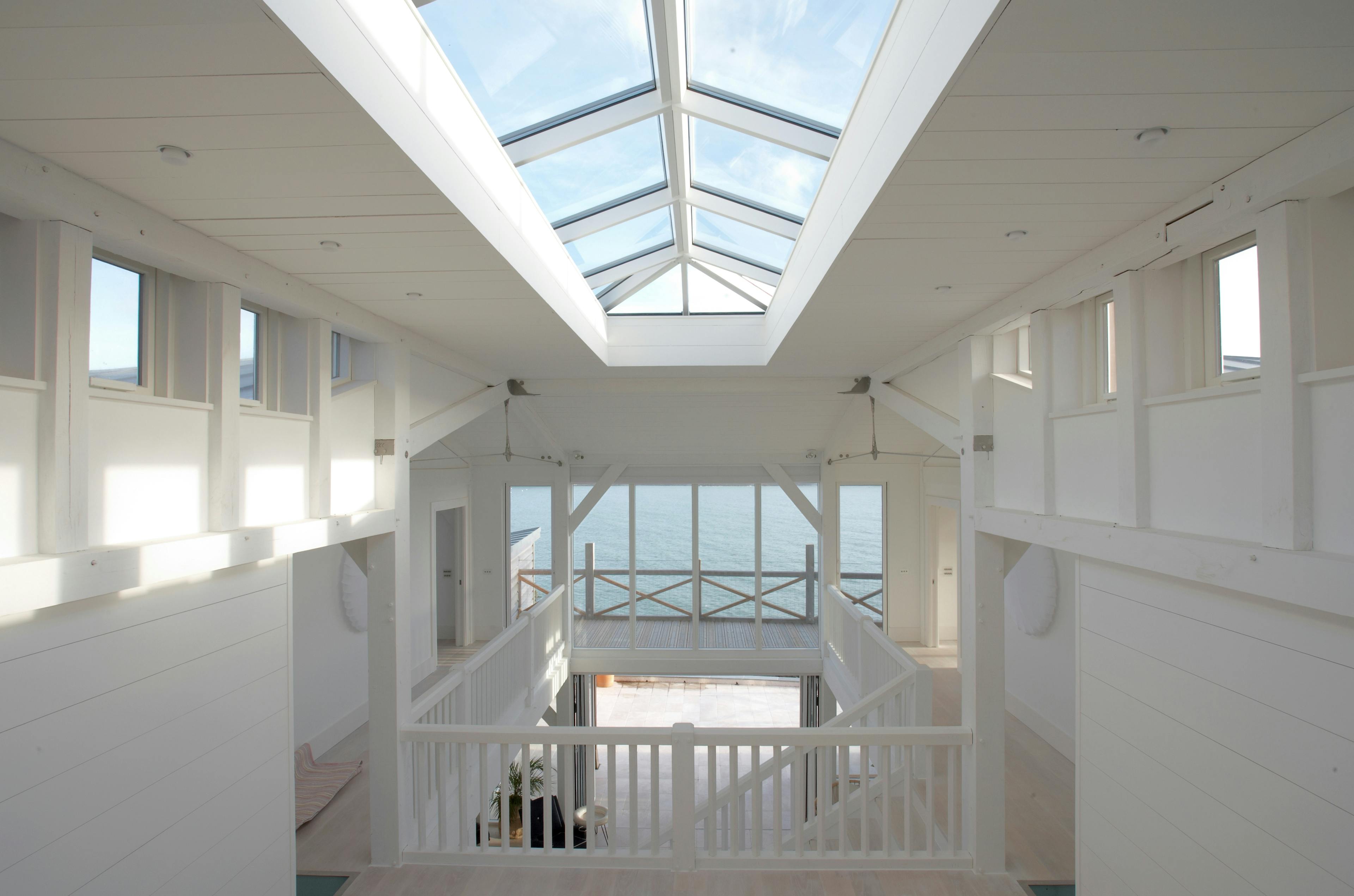 De Glanville – an impressive home built on a cliffside location on the St Mawes estuary in Cornwall. This home has a glazed double height space and large roof lantern to allow in plenty of natural light and for views of the estuary. The Douglas fir frame has been painted white for a coastal style to match the surroundings. Read more about this project.
