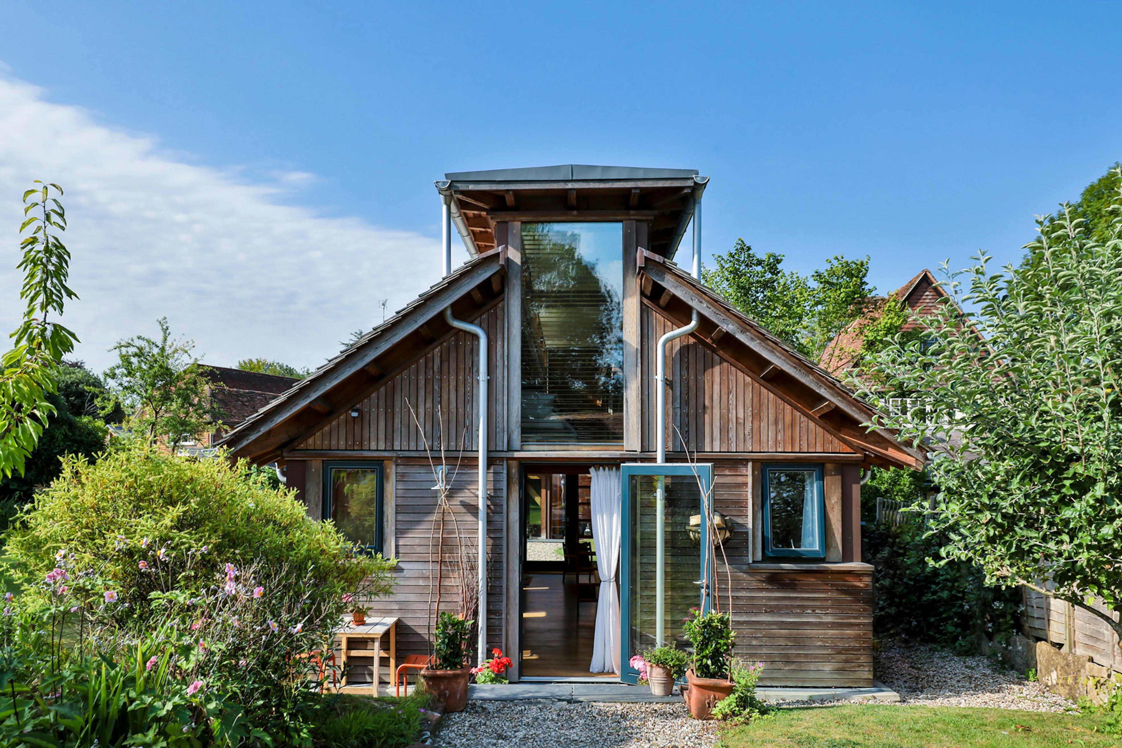 Allies Farm – this attractively finished award-winning new-build family farmhouse uses a distinctive blend of Douglas fir and steel ties combined with a curved roof over the straight frame. Well-planned glazing and rooflights allow in plenty of natural light and a ground source heat pump, solar light, and solar thermal panels have been fitted to heat the house. Externally the home had to complement the Second World War airbase it’s situated on, and it’s been finished with larch cladding and a steel roof, and features a unique tower for 360 views of the surroundings. Read more about this project.
