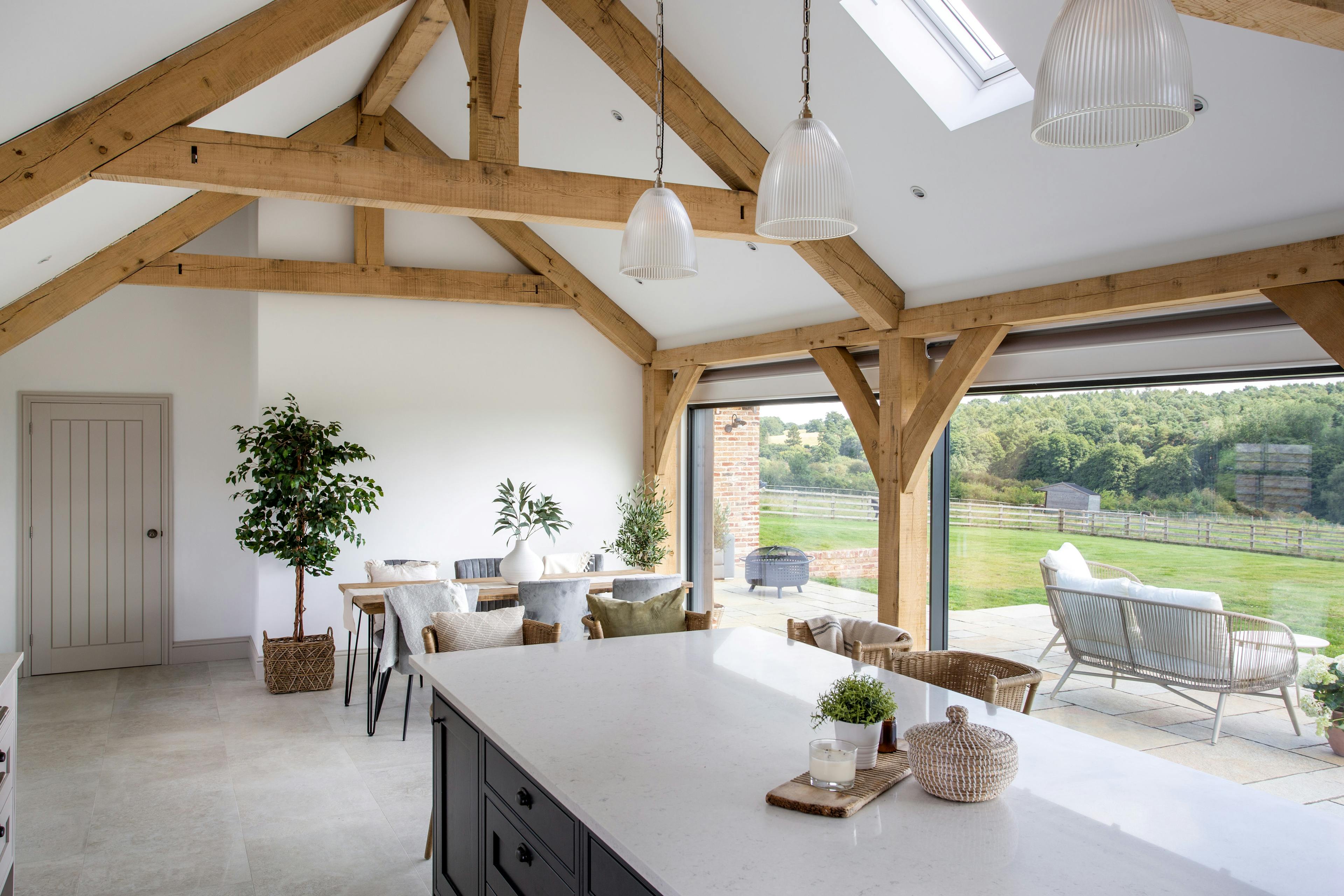 Timber framing offers a versatile and practical solution, allowing large spans and uninterrupted sight lines, while also introducing natural warmth and architectural character. Timber frames, for example, can help define specific zones – such as kitchens, dining areas and living spaces – without the need for solid partitions, maintaining visual connection throughout the plan.