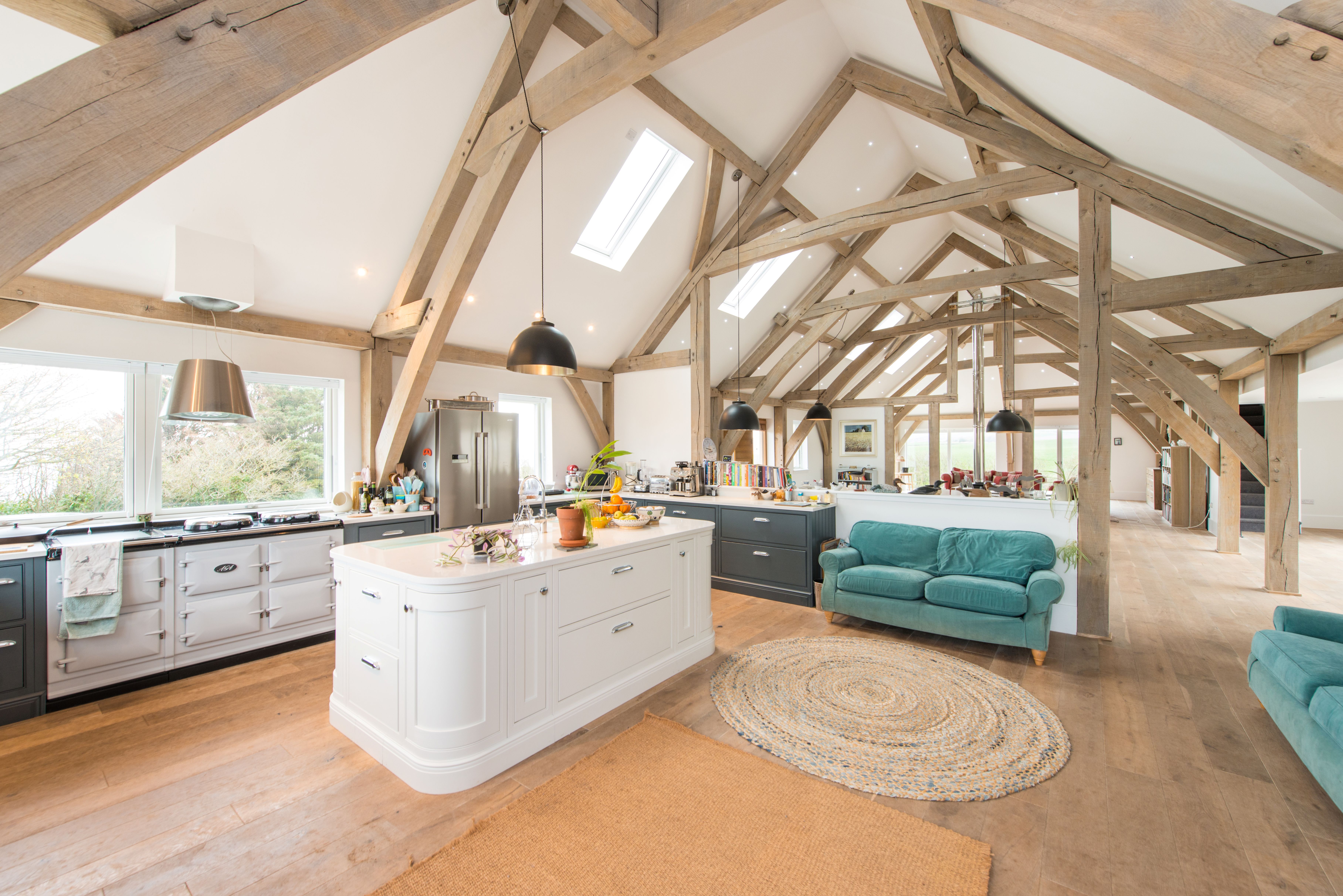 Carpenter Oak has designed, crafted, and installed frames for many, many different kinds of homes, and all of them unique. Our customers often choose an open plan layout, and this works well with a timber frame, providing spacious and versatile family living spaces. These three homes were designed to incorporate open plan areas, and all three have done this in a different way, according to the tastes and aspirations of the homeowner.