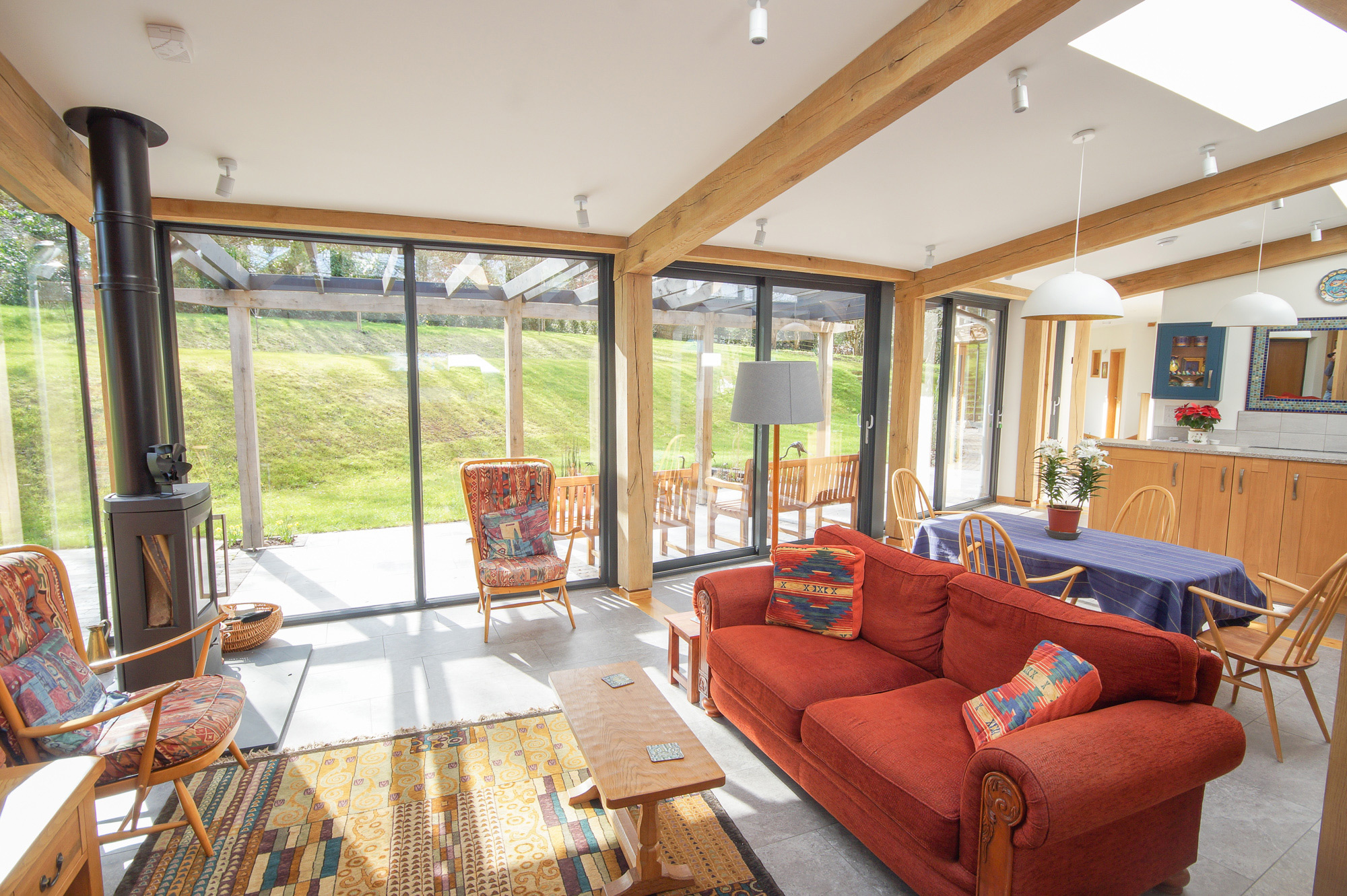 Internally you’ll be able to see both the oak frame and the joinery units/curtain glazing, and on large expanses you’ll often see bi-fold doors fitted to allow for indoor/outdoor living and easy access to outside space.